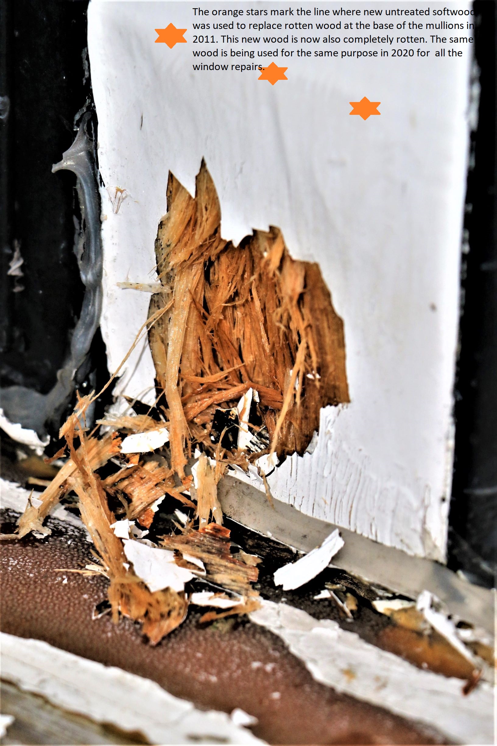 See here for a mullion repair carried out at 3 Essex House in August 2020 (10 years later) using the same untreated softwood used to cover over rotten wood. Essex House: Rotten wood covered over with sub-standard materials 6 August 2020